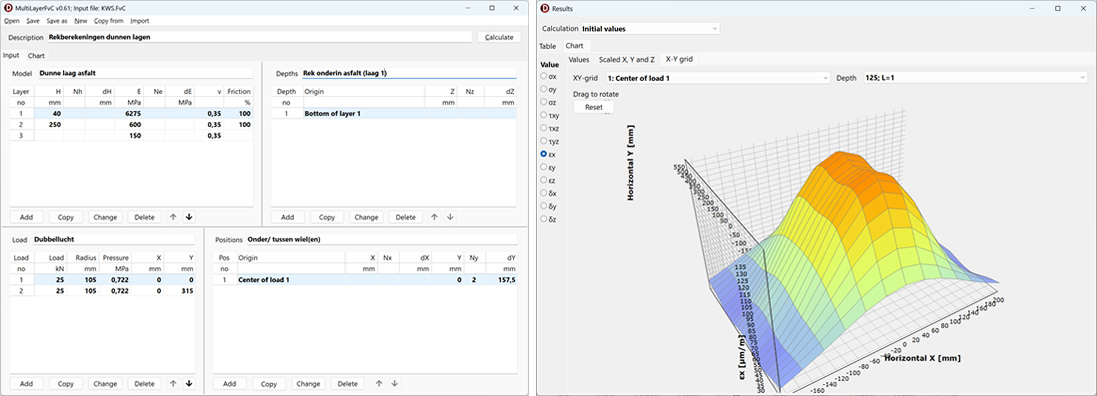 Omdat in Win11 geen oudere 16-bits programma’s meer kunnen worden geëmuleerd, hebben wij een moderne vervanger voor het meerlagenberekeningen in CARE, ZSTRESS en BISAR-PC ontwikkeld. Dit meerlagenprogramma gebaseerd op de Burmister theorie, MultiLayerFVC genaamd, is een 64-bits Pavers-tool waarbij je n-belastingen en n-lagen op een flexibele wijze kunt invoeren. De response bestaat uit spanningen, rekken, schuifspanningen, verplaatsingen en vervormingen, die je op willekeurige plaatsen (systematisch) kunt opvragen. De invoer en de response wordt tevens grafisch weergegeven. De uitvoer kan bijvoorbeeld naar Excel zodat je daar verder kunt rekenen.